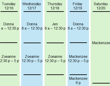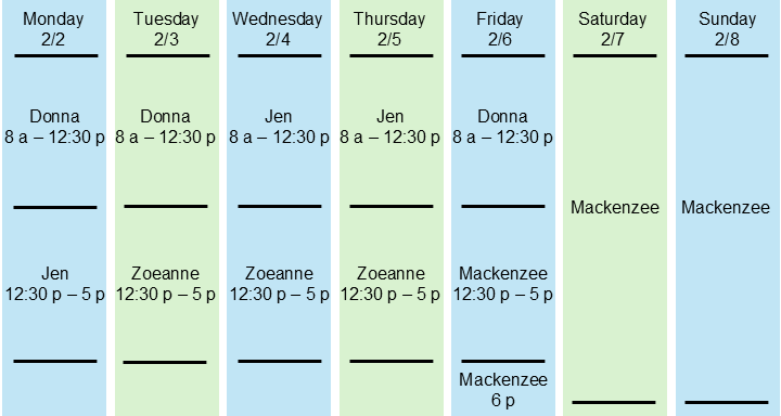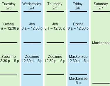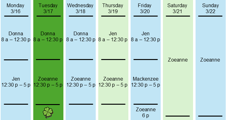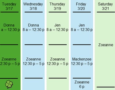 We want you to know who is taking care of you. Here is our contact team and a schedule of who will be taking care of you for the current week. During off hours, you can also know that one of these team members will be there for you.